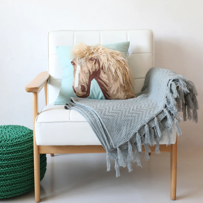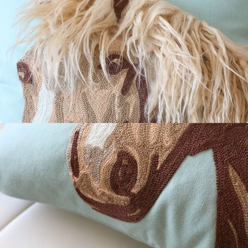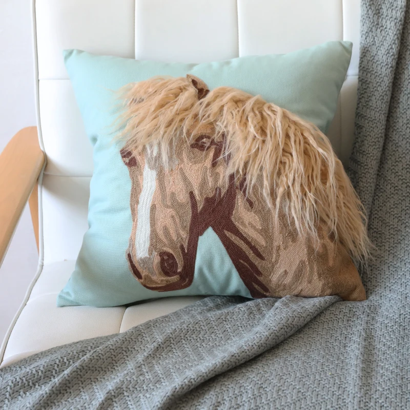 DUNXDECO Cushion Cover Decorative Pillow Case Modern Simple Horse Embroidery Blue Cushion Sofa Chai